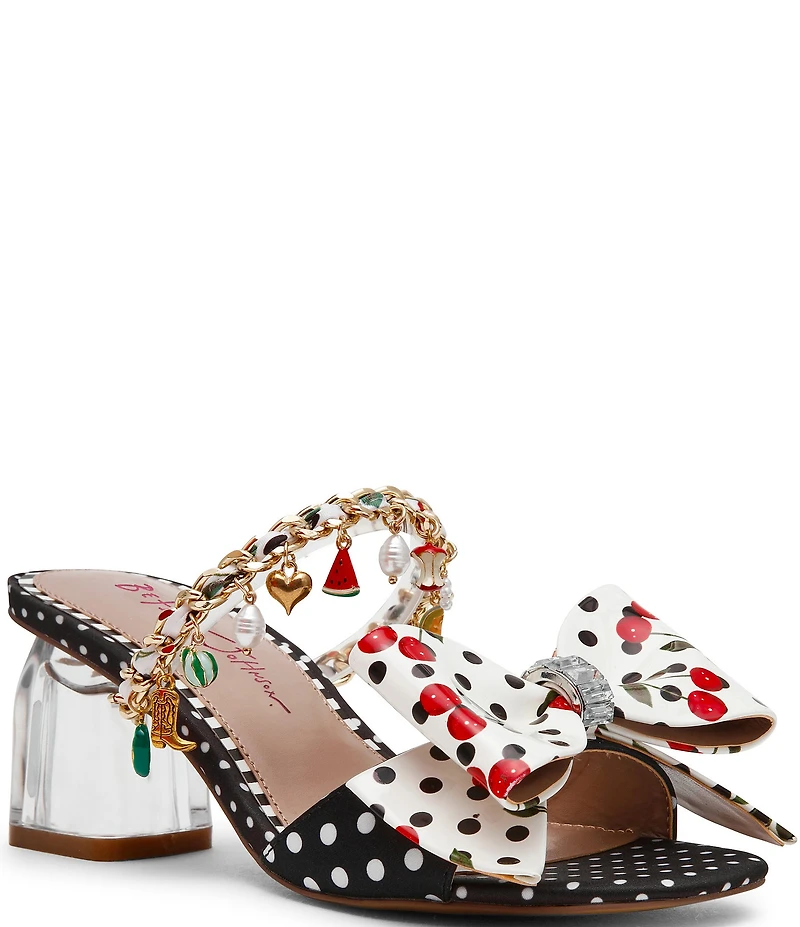 From Betsey Johnson, the Kayleen Polka Dot Print Charm and Bow Embellished Dress Sandals feature: Synthetic upper with bow detail Slip-on styling Synthetic lining Synthetic outsole Approx. 2.75" heel height Imported.