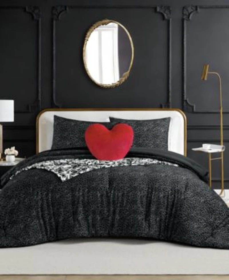 A sleek micro leopard print in shades of charcoal delivers bold, fashion-forward edge. The all-over animal print brings runway energy to your bed, while a plush red heart-shaped decorative pillow and throw adds that iconic Betsey wink because your bed should have as much personality as you do.