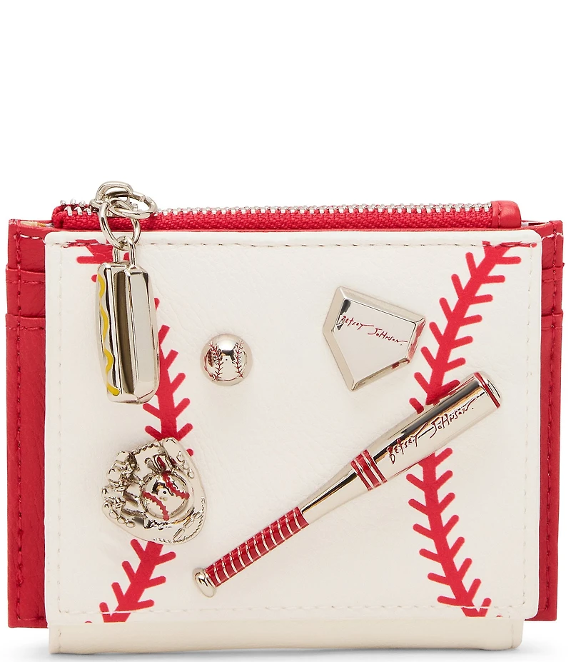 From Betsey Johnson, the Playing The Field Wallet features: PU faux leather 6 card slots Center zipper compartment Snap closure Approx. 4.62'' L x 0.5'' W x 3.37'' H Imported.