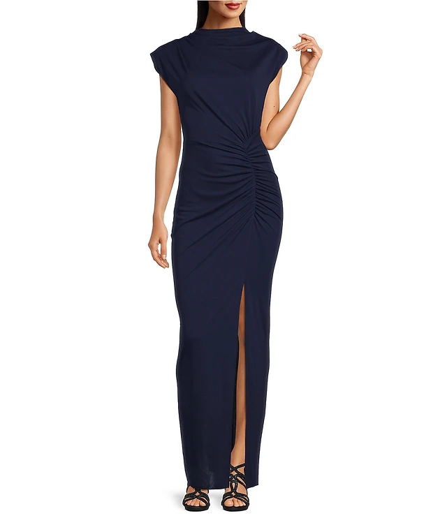 Betsy & Adam Matte Jersey Mock Neck Sleeveless Ruched Sheath Gown