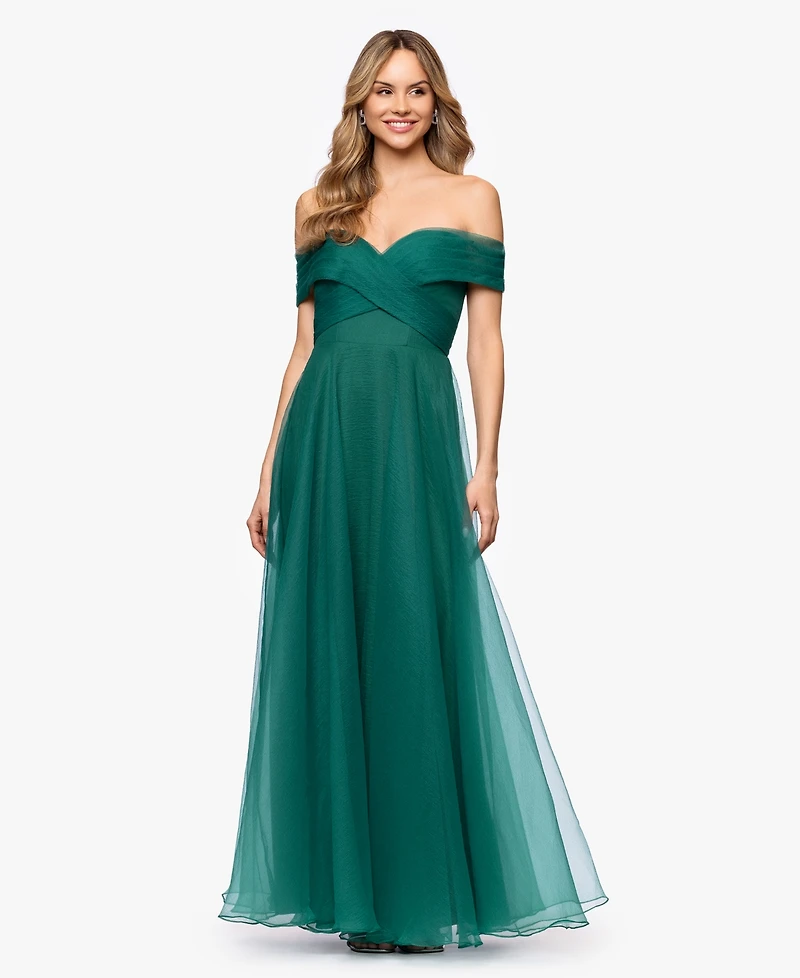 Betsy & Adam Petite Mesh Off-The-Shoulder Ball Gown in Franklin, TN