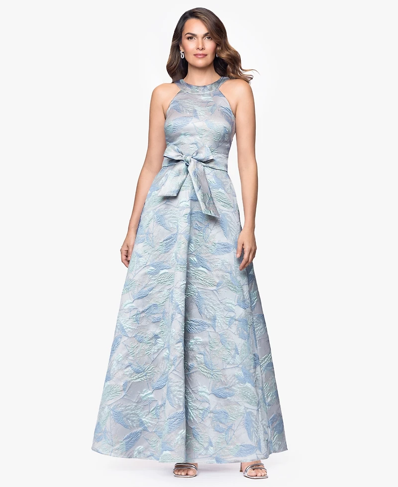 Gleaming brocade accented with an elegant bow detail creates stunning sophistication in this halter dress from Betsy & Adam, complete with center back zipper closure. Floor-sweeping length delivers dramatic elegance for formal occasions and special celebrations.