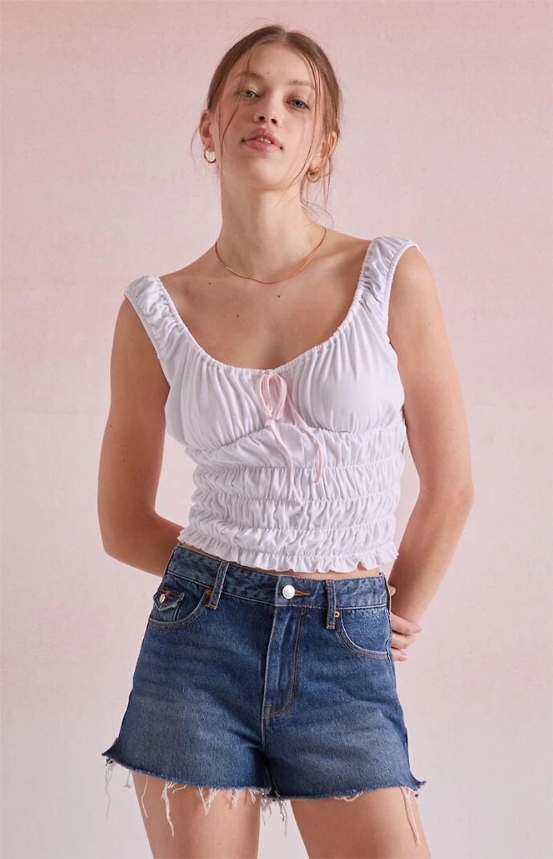 The Bow Tie V-Neck Ruched Tank Top from Beverly and Beck is a sweet and stylish staple with a flattering fit. Designed with a scoop neckline, wide fixed straps, and a tie-front detail, this slim-fit cropped tank features a ruched bodice for a touch of texture and effortless charm.