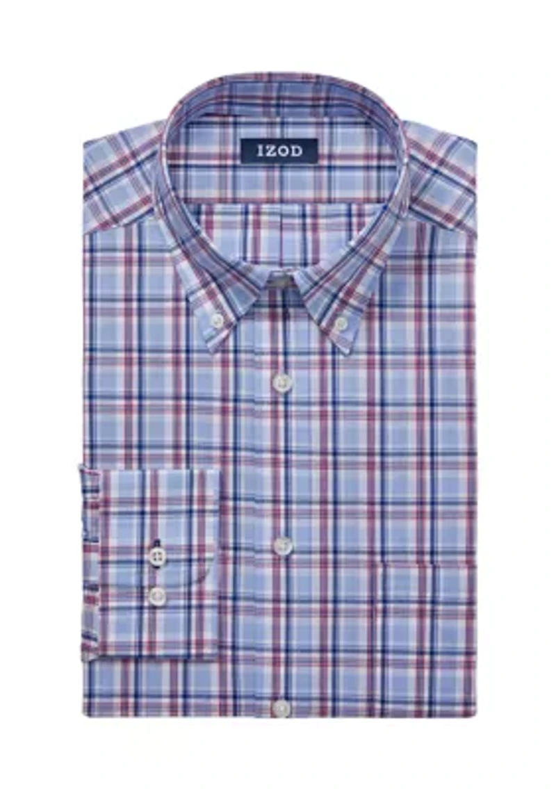 Donning a handsome plaid pattern, this dress shirt from IZOD is made with a hint of stretch for maximum comfort. Button closure Button-down collar Long button-cuff sleeves Plaid pattern Imported Material & Care Cotton, polyester Machine washable
