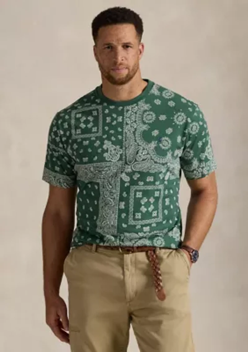 This Polo Ralph Lauren t-shirt features a bold, all-over bandanna pattern on soft, comfortable jersey fabric. Designed for a relaxed fit, it’s ideal for casual, everyday wear with a stylish twist. By choosing Ralph Lauren's cotton products, you're supporting investment in the Better Cotton™ mission to help cotton communities survive and thrive, while protecting and restoring the environment. This product is sourced via a system of mass balance and therefore may not contain Better Cotton™. Visit bettercotton.org/mass balance for more information about mass balance. Signature embroidered Pony at the left chest Short sleeves Crew neck Regular fit Imported Product Specifications Size Big 2X has a 33.5” body length (front and back), a 22.5” shoulder, and a 56” chest Size Tall 2L has a 35.5” body length (front and back), a 22.5” shoulder, and a 56” chest Material & Care 100% cotton Machine washable