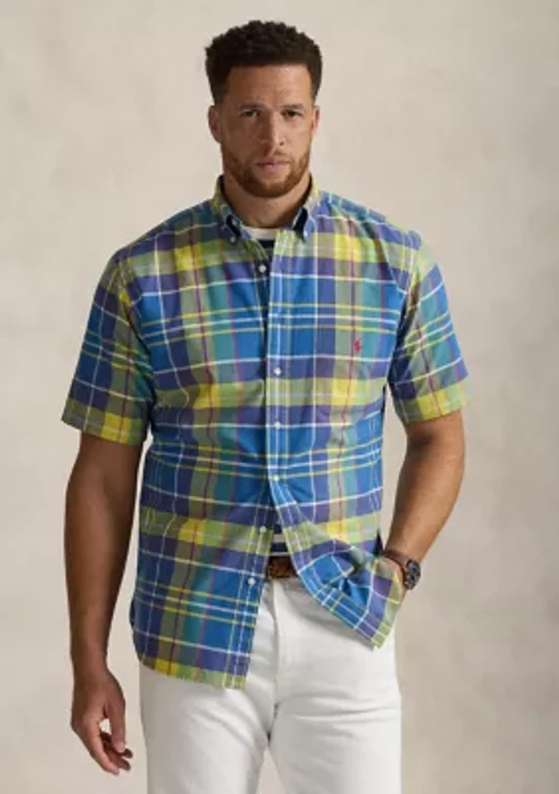A multicolored plaid print enlivens this collared shirt from Polo Ralph Lauren. Size Big 2X has a 34” back body length, a 22” shoulder, and a 62.25” chest Size Tall 2L has a 36” back body length, a 22.5” shoulder, and a 62.25” chest Button-down collar Buttoned placket Short sleeves Left chest patch pocket Split back yoke with a box pleat ensures a comfortable fit and a greater range of motion Signature embroidered Pony at the pocket By choosing Ralph Lauren's cotton products, you're supporting investment in the Better Cotton™ mission to help cotton communities survive and thrive while protecting and restoring the environment. This product is sourced via a system of mass balance and therefore may not contain Better Cotton™. Visit bettercotton.org/massbalance for more information about mass balance. Imported Material & Care Cotton Machine washable