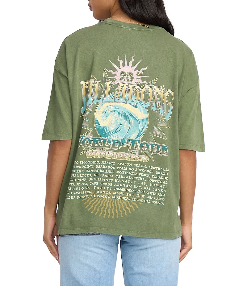 From Billabong, this t-shirt features: Crew neckline Short sleeves "Billabong" logo, graphic, and "World Tour 1973" screen print on the front and back Pullover styling Mineral-wash cotton loose-knit jersey Machine wash/tumble dry Imported.
