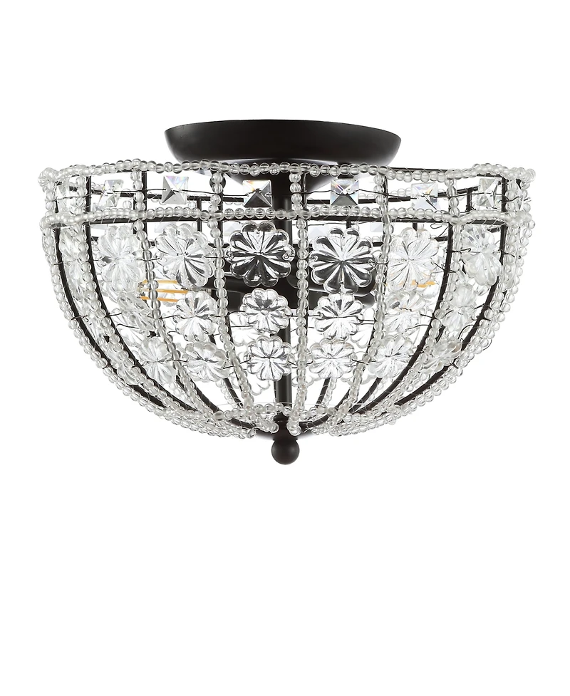 Add drama and sparkle to your ceiling with our modern, feminine semi-flush light fixture. Flower crystals are set into a crystal-covered black metal shade. This light fixture is a glamorous addition to your hallway, bedroom or bathroom. Two included Led bulbs provide plenty of light.