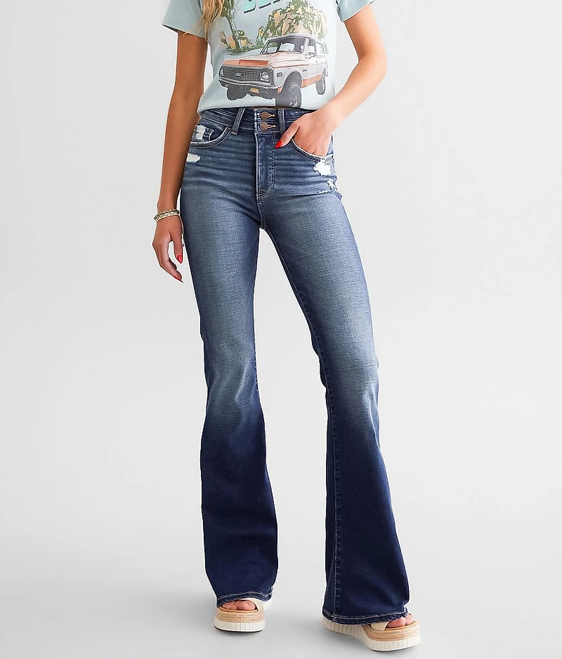 Superior Stretch (High Stretch) - Superior stretch fabric, our highest level of stretch for ultimate movement. High rise Slim through the hip and thigh 24 1/2" flared bottom opening Pieced waistband Destruction details