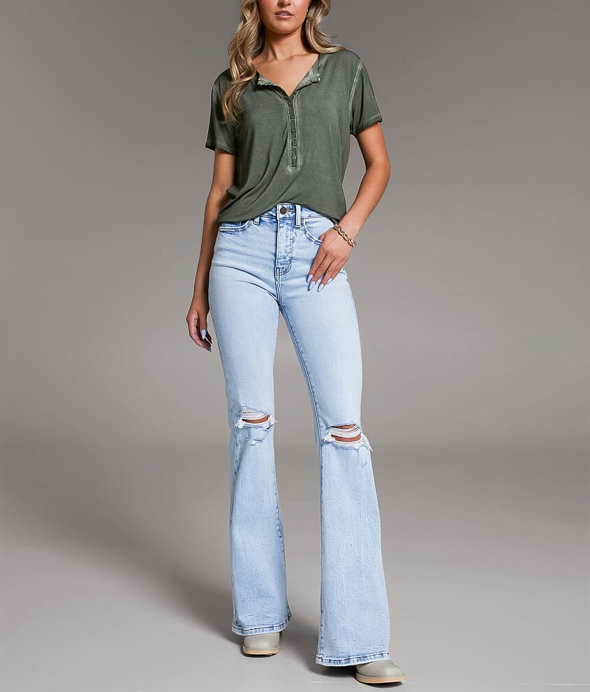 Superior Stretch (High Stretch) - Superior stretch fabric, our highest level of stretch for ultimate movement. High rise Slim through the hip and thigh 24 1/2" flared bottom opening Destruction details
