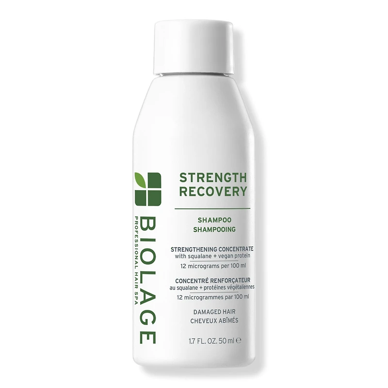 STRENGTH RCVY SHAMPOO 1.7OZ. Benefits: Gently cleanses and detangles damaged hair. Reduces breakage and adds strength. Locks in moisture and strengthens strands. Restores hair's natural movement and softness. Suitable for color-treated hair. Key Ingredients: Olive Squalane (distilled): Locks in moisture and protects hair from breakage. Vegan Proteins (distilled): Strengthen hair, smooth out split ends, and improve elasticity. Research Results: 3x stronger hair after one use*. Protected hair. Soft, shiny, nourished hair with a long-lasting style. Hydrated hair. Hair looks and feels naturally healthy. *Strength Recovery Shampoo and Conditioner vs. non-conditioning shampoo. Packaging may vary.