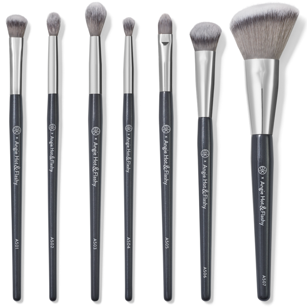 Angie Hot & Flashy Brush Set. Features: Ultra-soft synthetic bristles for seamless blending. Vegan & cruelty-free fibers. Precision-cut heads for control. Ergonomic balanced handles. Durable easy-to-clean design. Benefits: Creates a smooth airbrushed finish with minimal effort. Provides even streak-free coverage. Feels gentle on all skin types. Elevates everyday makeup to professional-quality results. Includes: A501 Lid Shader Brush. A502 Crease Shader Brush. A503 Blender Brush. A504 Detailer Brush. A505 Shimmer Brush. A506 Concealer (Kitten Paw) Brush. A507 Angled Blush Brush.