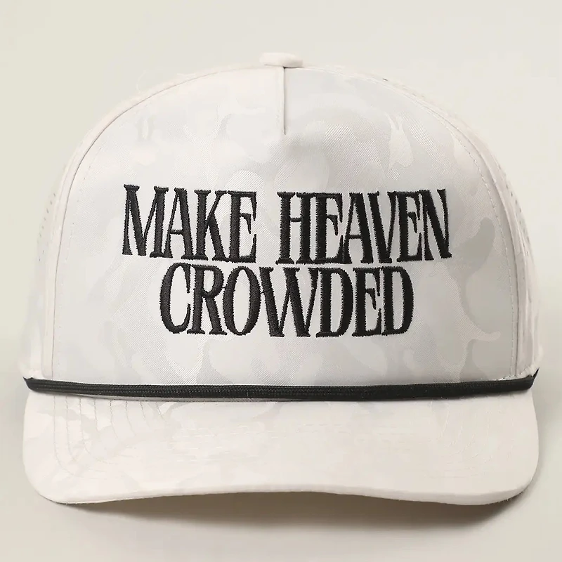These custom white hats feature the embroidered phrase “MAKE HEAVEN CROWDED” in various colors. They include subtle camouflage patterns, breathable perforations, and decorative piping details around the brim. This 5-panel trucker hat features a subtle white camo print paired with a classic rope strap detail for a clean yet distinctive look. Crafted from lightweight, breathable 100% polyester, it offers comfortable all-day wear. The structured front panel is balanced with a pre-curved visor and a relaxed fit. Finished with an adjustable snapback closure, this hat provides a secure, customizable fit that suits a wide range of styles and occasions.