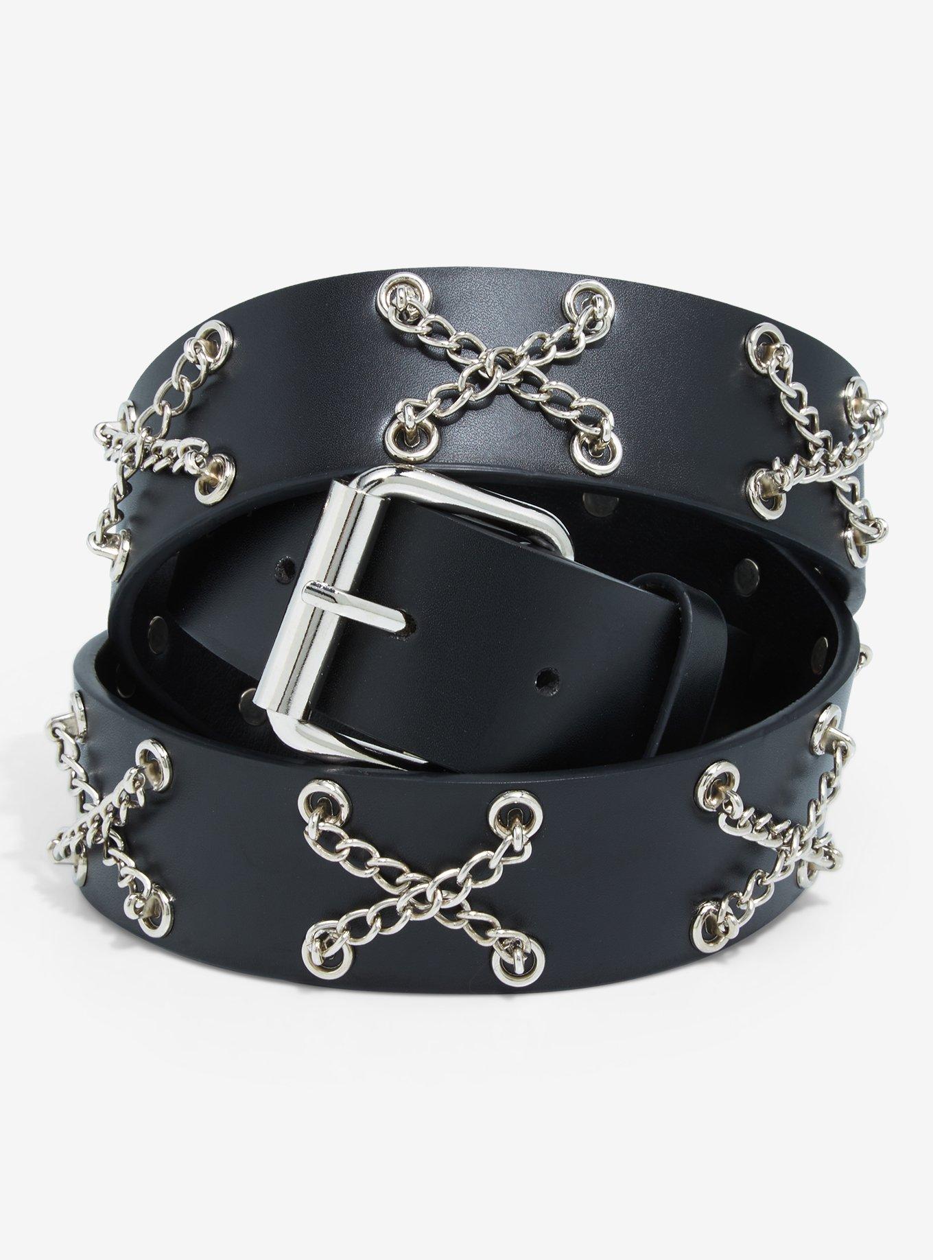 Add an edge to your look with this black faux leather belt featuring silver-tone crisscross chains.