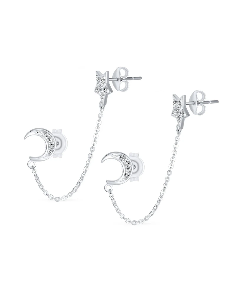 For a trendy twist on a moon stars choose these chic earrings. Featuring a stud earring, and a chain linked earring with star stud for the same earlobe.
