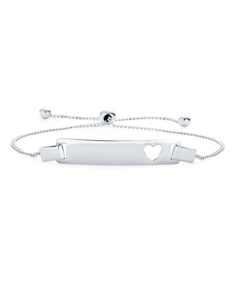 Give your heart to a beloved little one in your life with this enchanting id bracelet. Highlighted by a charming adjustable bolo design, with a name Id tag at center, adorned with one, delicate heart motif. Composed entirely of lustrous .925 silver