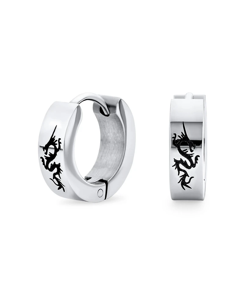 Tribal and edgy, he'll love our 0.5in, black Ip plated steel huggie hoops to enhance any ensemble. With a laser etched dragon, these earrings are a great gift.