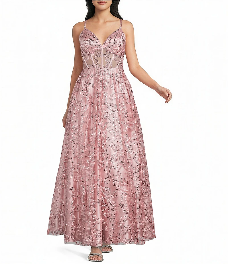 From Blondie Nites, this ballgown features: Glitter bow patterned fabric Sweetheart neckline Spaghetti straps Pleated skirt Lace up tie back closure Approx. 56" length Nylon/polyester; lined Spot clean Imported.