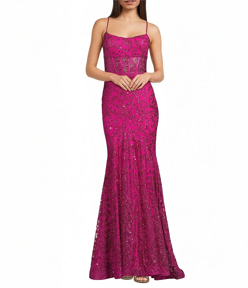 From Blondie Nites, this ballgown features: Glitter patterned fabric Scoop neckline Spaghetti straps Illusion corset  Lace-up tie back closure Zip back closure Approx. 61" length Nylon; lined Hand wash/line dry Imported.