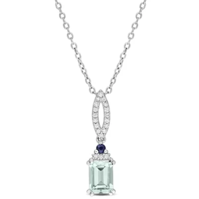 Add a touch of refined elegance with this stunning necklace, featuring a luminous octagon aquamarine paired with deep blue sapphires and delicate diamond accents, all set in sterling silver. Its graceful design catches the light beautifully, creating a subtle shimmer that enhances any outfit. Perfect for both everyday sophistication and special occasions, this piece embodies timeless style with modern charm. Spring ring clasp, 1 aquamarine, 1 blue sapphire, 19 diamond Color rating: G, H Clarity rating: I2-I3 Polished finish Prong setting Warranty available, 60 days Thailand Imported Product Specifications 6-mm width x 22.5-mm height, 18" 1ct. t.g.w. aquamarine, blue sapphire, 1/10ct. t.w. diamond Material & Care Sterling Silver Metal, Sterling silver Clean with a soft cloth.