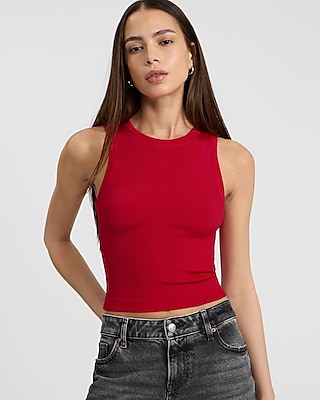 A body contour tank complete with a seamless ribbed material and a shiny finish. You'll constantly reach for this top with enough stretch to smooth, sculpt, and define your figure.