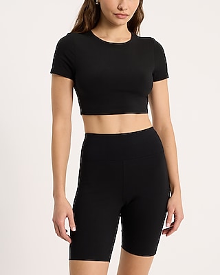 A body contour top made to smooth, sculpt, and define your figure with a double lined front. This baby tee is created with a cotton-hand feel, a crew neckline, short sleeves, and cropped length.