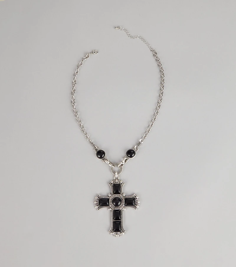 Bold details, effortless styling. This cross statement necklace adds instant attitude to necklines when your outfit needs a confident finishing touch without overthinking it. Fit & Features Chunky chain design Statement cross pendant with black stone accents Textured metal detailing Lobster clasp closure with extender