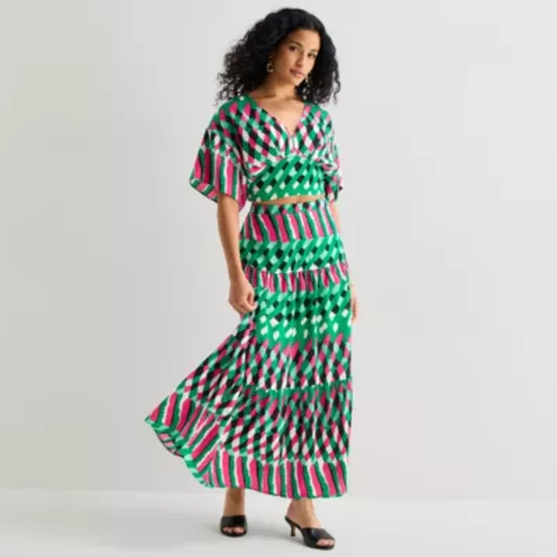 When the temps rise, turn up your style as well with bright colors and textures thanks to this Bold Elements women's skirt. Made from soft twill, this maxi skirt has an eye-catching bright multicolor striped pattern with a high flat front waistline and tiered skirt layers. Wear it with the matching top.