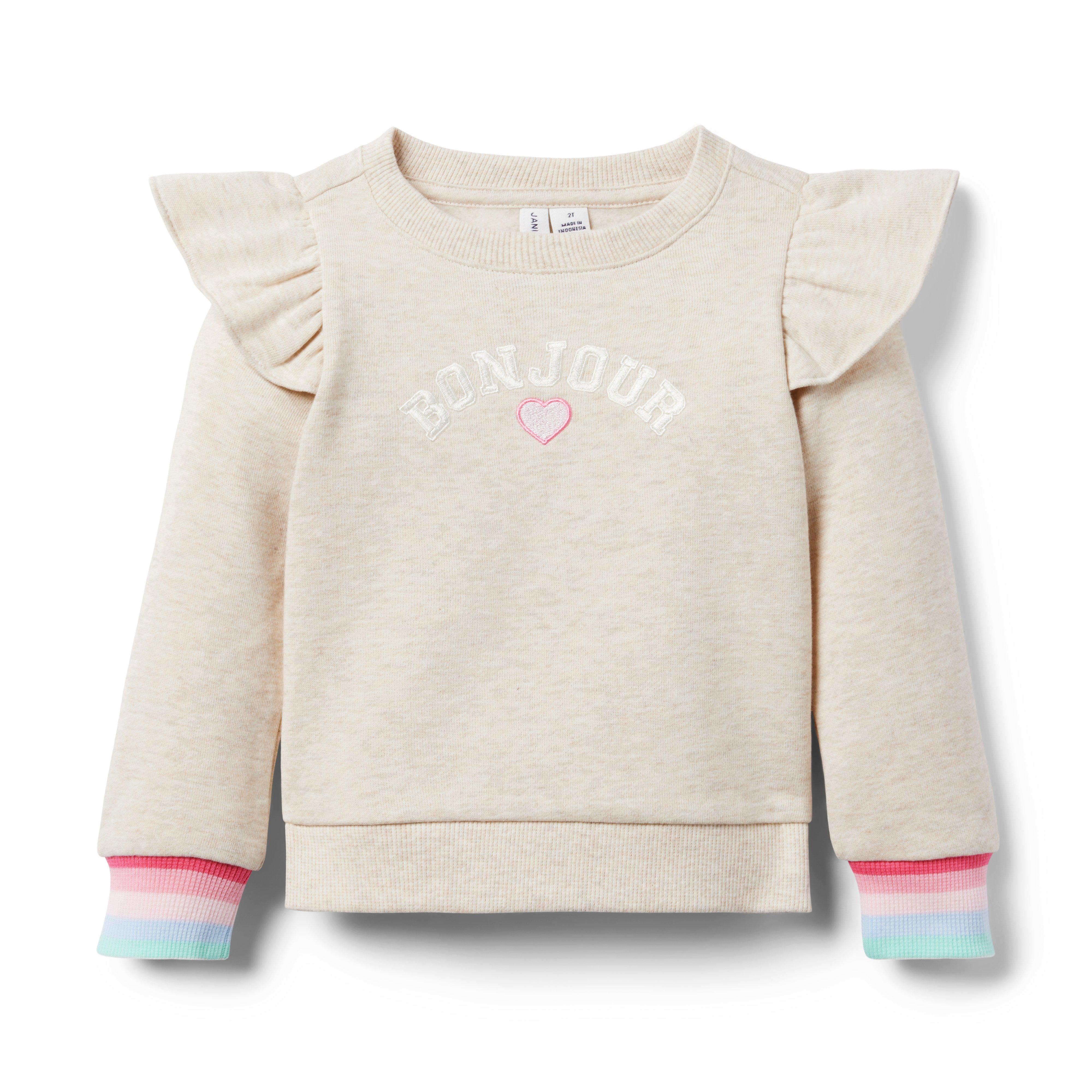 Say hello to their new favorite sweatshirt. Made in soft fleece with an embroidered Bonjour graphic, plus ruffle shoulders and striped cuff details to love. 60% Cotton/40% Polyester Fleece Long Sleeve Machine Washable; Imported