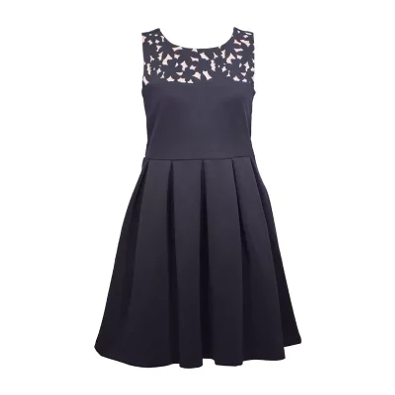 Bonnie jean sleeveless solid navy scuba dress features a lace inset bodice to pleated skirt . Great for all occasions.