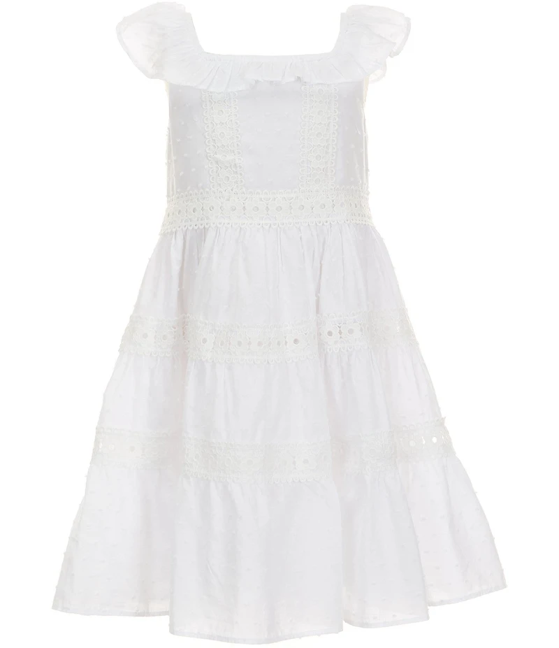 From Bonnie Jean, this dress features: Clip-dot lace pattern Ruffled square neckline Flutter sleeves Lace-inset detailing throughout Full, pleated ruffle-tier skirt Pullover styling Cotton Machine wash/tumble dry Imported.