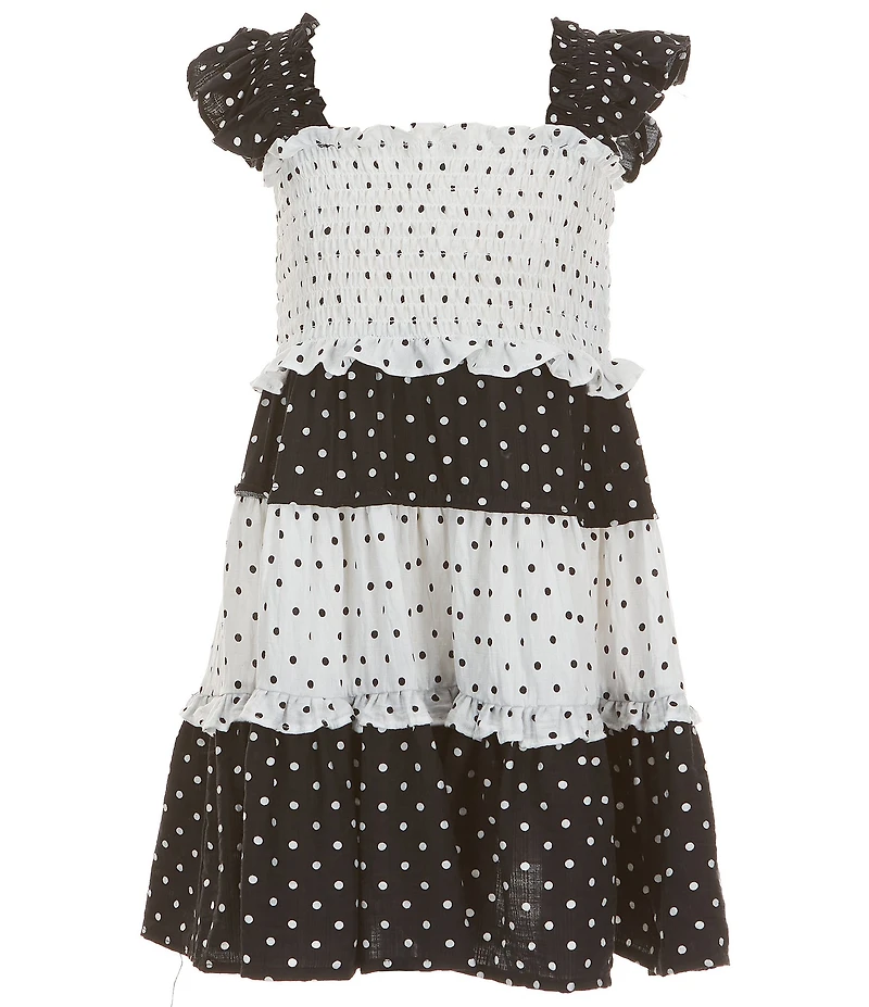 From Bonnie Jean, this dress features: Alternating mixed-dot design Square neckline Flutter sleeves Smocked bodice Full, pleated tiered skirt Pullover styling Rayon/nylon Machine wash/line dry Imported.