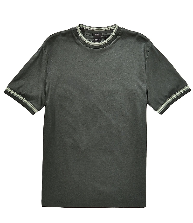 From BOSS, this t-shirt features: Solid tone with contrast tipping at collar and sleeves Crewneck Short sleeves Slim fit Pullover construction Mercerized interlock cotton Machine wash cold/tumble dry Imported.