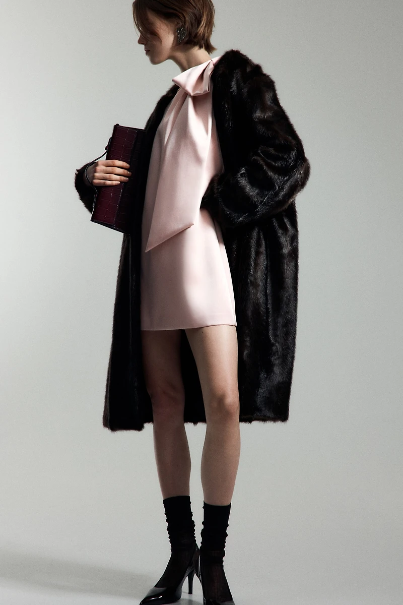 Short, fitted dress in thick woven fabric with a slight sheen. One wide shoulder strap with a large, decorative bow at top, asymmetric neckline, and a concealed zipper at one side with hook-and-eye fastening. Unlined.