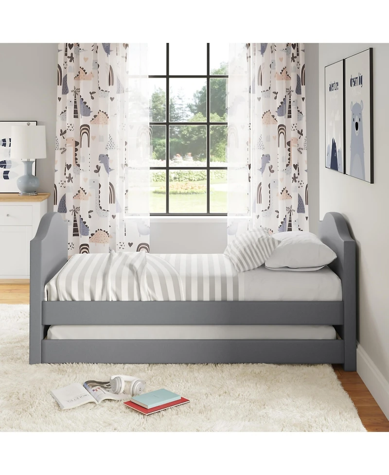 This daybed is fully upholstered and slightly padded to give it a premium look and feel. Its sofa back is tufted, hugged by sloping track arms with nailhead trim, providing a modern and elegant design. The trundle drawer of the daybed rolls out with ease, and when closed, it gives the appearance of a real sofa, with no visibility to the mattress and bedding inside.The trundle and bed area have supportive wood slats, providing a comfortable sleeping surface. Constructed of durable Mdf, the frame of this cute and functional daybed provides a reliable structure. You can use twin mattresses of your choice, and the trundle can hold a mattress up to 8 inches, giving you the flexibility to choose a deeper mattress on top, depending on your preference. The daybed ships in two boxes and comes complete with all the necessary hardware and instructions to assemble it quickly and easily.