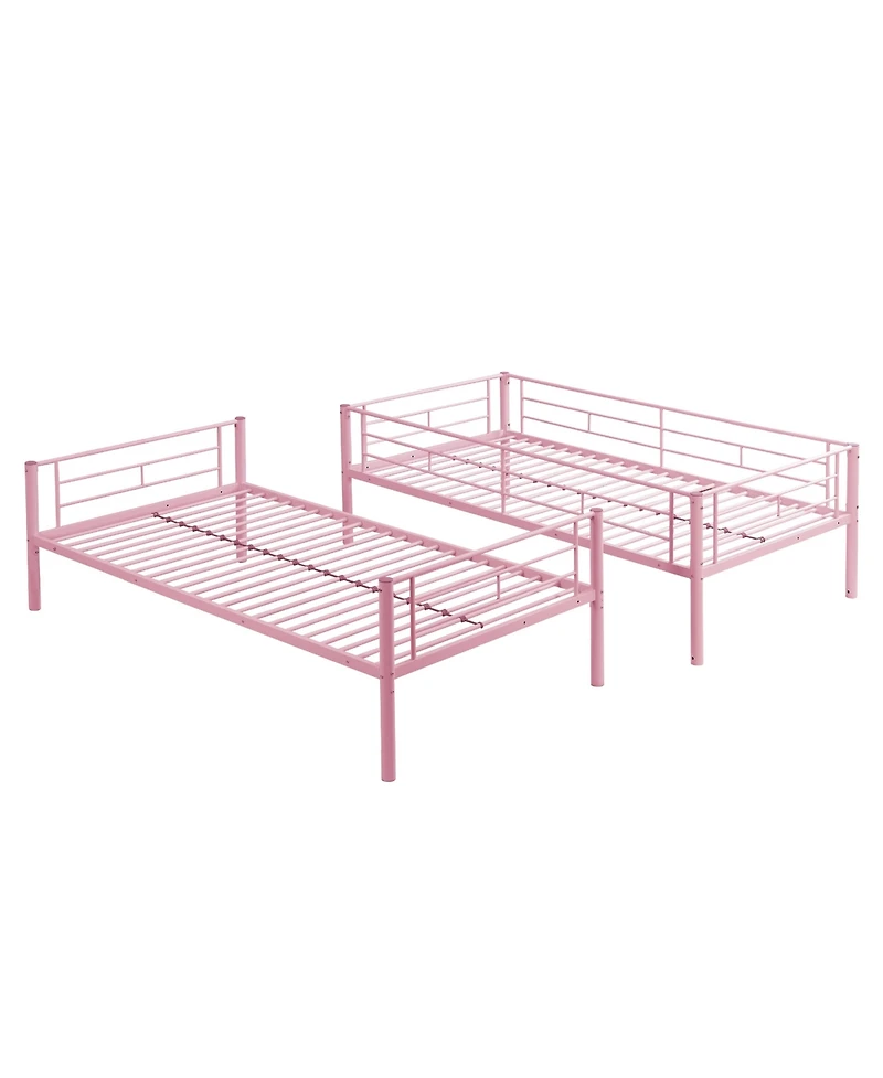 This Pink Twin Over Twin Metal Bunk Bed adds modern style and comfort to any bedroom while saving space. Crafted with a strong steel metal structure, it ensures durability, stability, quiet noise-free use, and large bearing capacity, plus safe stairs for easy upper bunk access. No box spring is needed—it works with all mattress types including memory foam. The package includes clear instructions, all parts and tools for hassle-free assembly. Weight limit: 250/350 Lbs. Assembled dimensions: 78.00"L x 41.75"W x 65.25"H product weight: 77.44 lbs. Delivered as 1 set in 1 carton (package size: 81.10"L x 14.57"W x 5.90"H, 84.26 lbs).