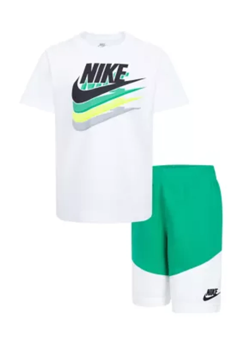 A fit that's perfect for playtime. This cool set from Nike® comes complete with a graphic t-shirt and a pair of color-blocked shorts. 2 Elastic waistband Crew neck Imported Material & Care Polyester/Cotton Machine washable