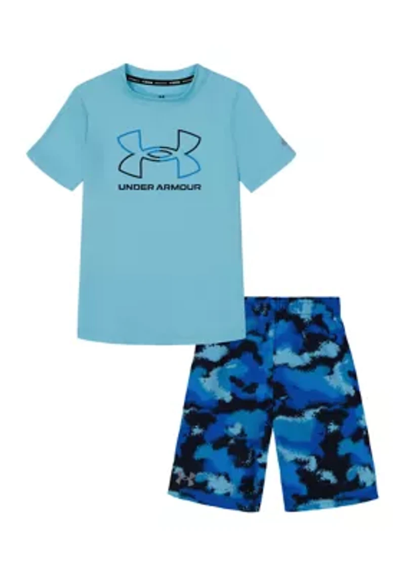 Made to match, this super cool set features a short-sleeved shirt with the Under Armour® logo and camo-printed shorts. 2-piece set Shirt: pullover, crew neck, short sleeves Shorts: elastic waistband Imported Material & Care Polyester Machine washable