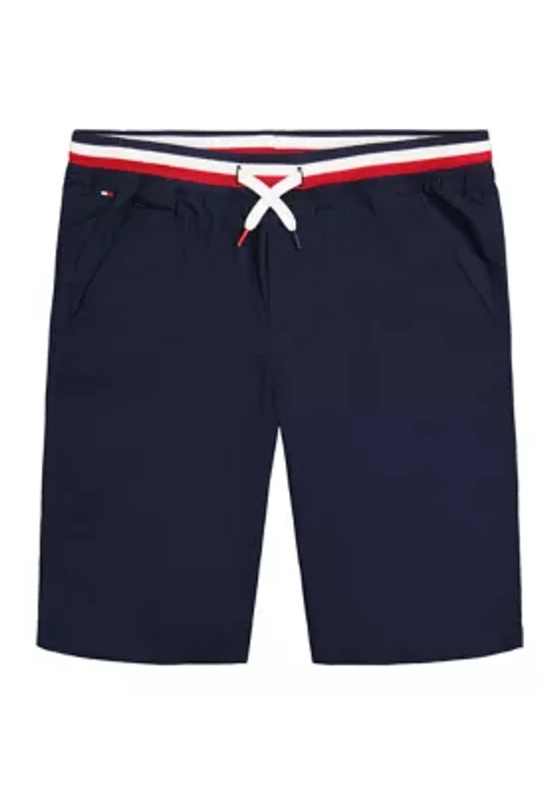 These knit shorts feature a stretchy elastic waistband with the iconic Tommy Hilfiger flag. Drawstring closure Regular fit Straight leg Imported Material & Care Cotton Machine washable