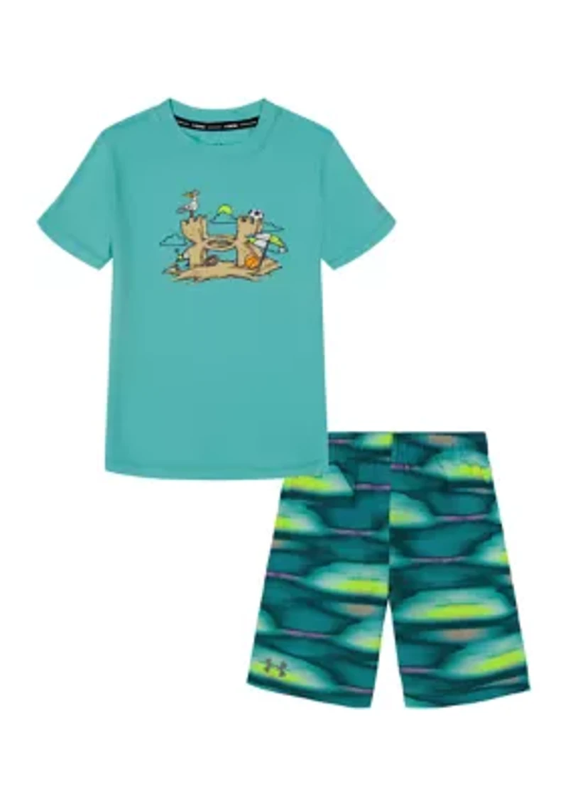 This Under Armour® graphic set comes with a short-sleeved t-shirt and printed shorts. 2-piece set T-shirt: pullover, round neck, short sleeves Shorts: elastic waistband Imported Material & Care Cotton, polyester blend Machine washable