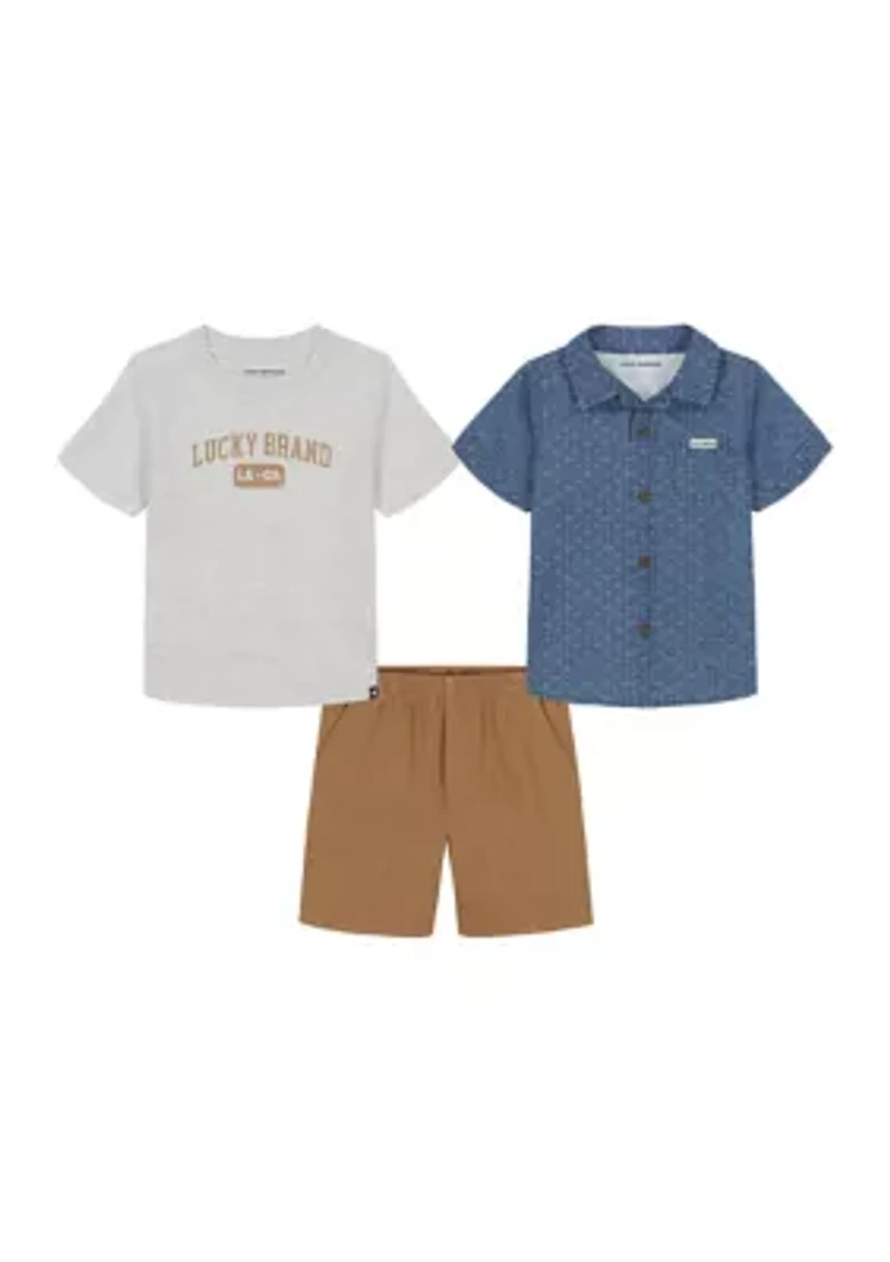 Lucky Brand's outfit is perfect for any occasion, whether it's a casual day at home or his next playdate. The breathable cotton blend ensures comfort all day, while the elastic waistband provides a secure and adjustable fit. This set includes a collared shirt, shorts, and a short-sleeve t-shirt. 3-piece set T-Shirt: pullover, crew neck, short sleeves Shirt: button closure, collar, short sleeves, 1 chest patch pocket Shorts: elastic waistband Imported Material & Care Cotton, polyester Machine washable