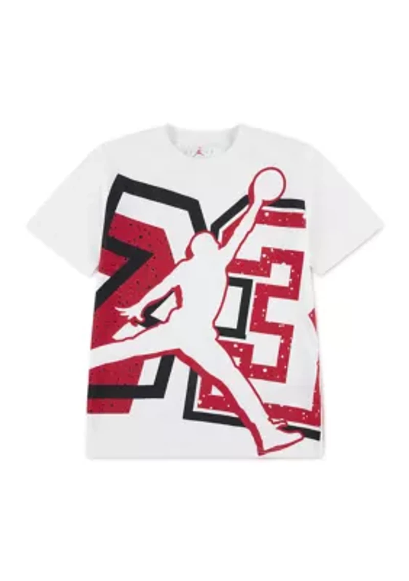 This Jordan top is perfect for active boys. Featuring a classic crew neck and short sleeves, this design is ideal for easy wear and all-day comfort. The pullover closure makes getting dressed a breeze. This versatile piece is ideal for everyday adventures, offering both style and practicality. Pullover Crew neck Short sleeves Imported Material & Care Cotton, polyester Machine washable