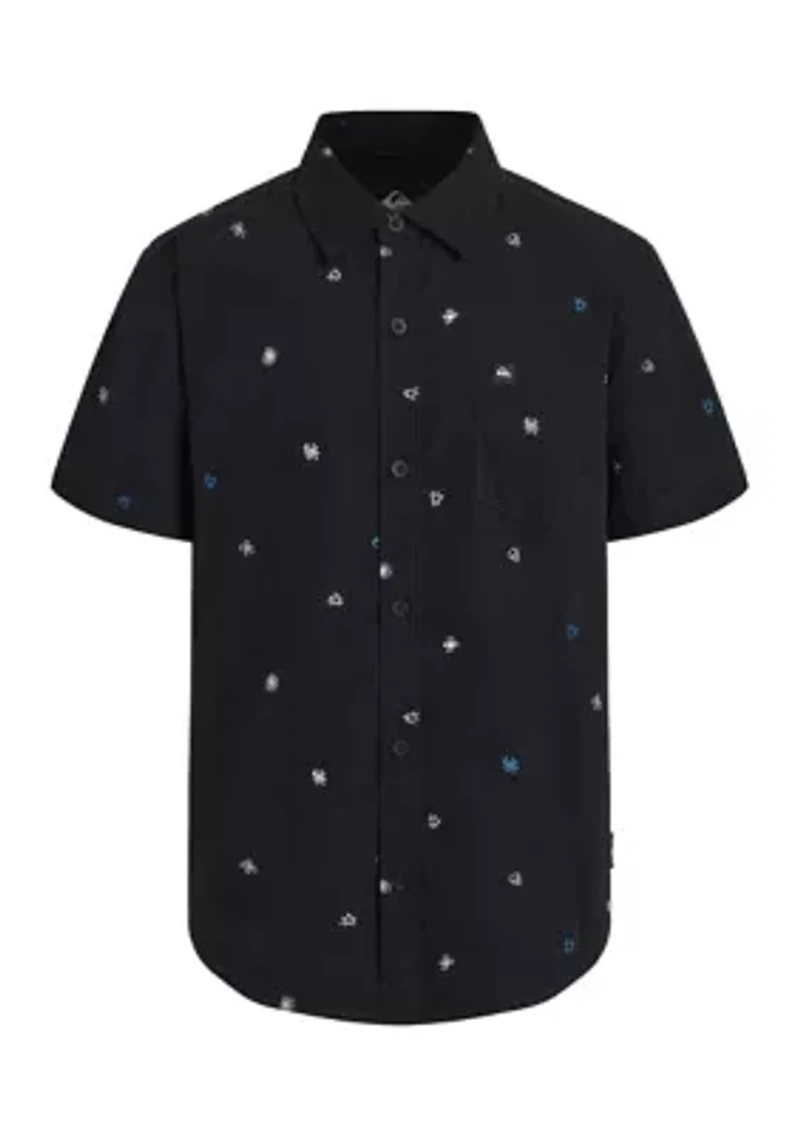 Crafted from breathable 100% cotton poplin, this Quiksilver shirt is designed for comfort and features a garment wash with enzyme softener. The all-over print adds a touch of personality alongside the woven logo label. This shirt is practical with a fashionable edge. Button-down front Collar Short sleeves Left chest patch pocket Imported Material & Care 100% cotton Machine washable