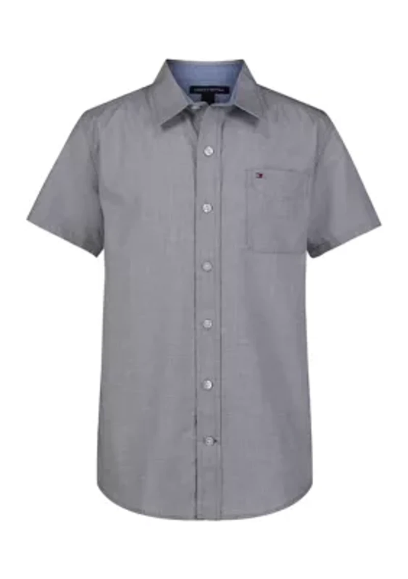 A handsome choice for any occasion, this solid button-down from Tommy Hilfiger can be paired with denim or khakis for a classic look. Button closure Collar Short sleeves 1 chest patch pocket Imported Material & Care Cotton, polyester Machine washable