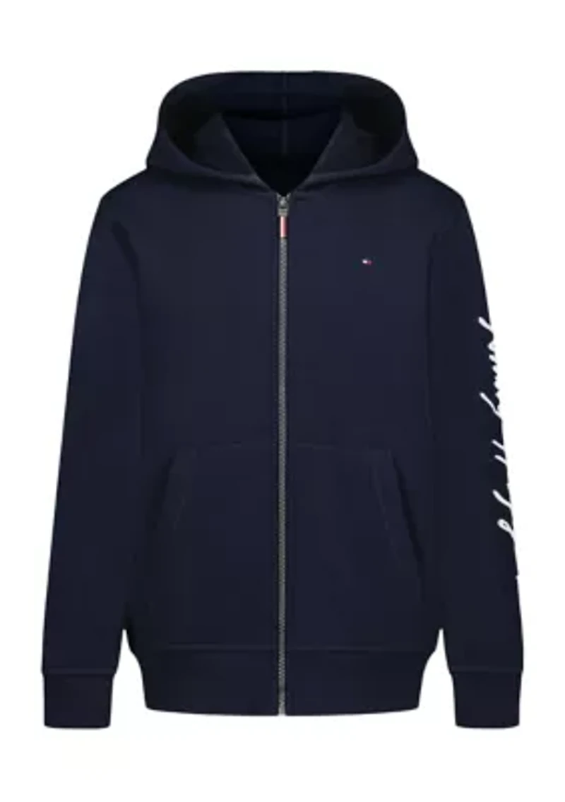 This comfortable full-zip hooded jacket from Tommy Hilfiger is perfect for layering and provides warmth without sacrificing mobility. Zip closure Hood Long sleeves Split kangaroo pocket Imported Material & Care Cotton, polyester blend Machine washable