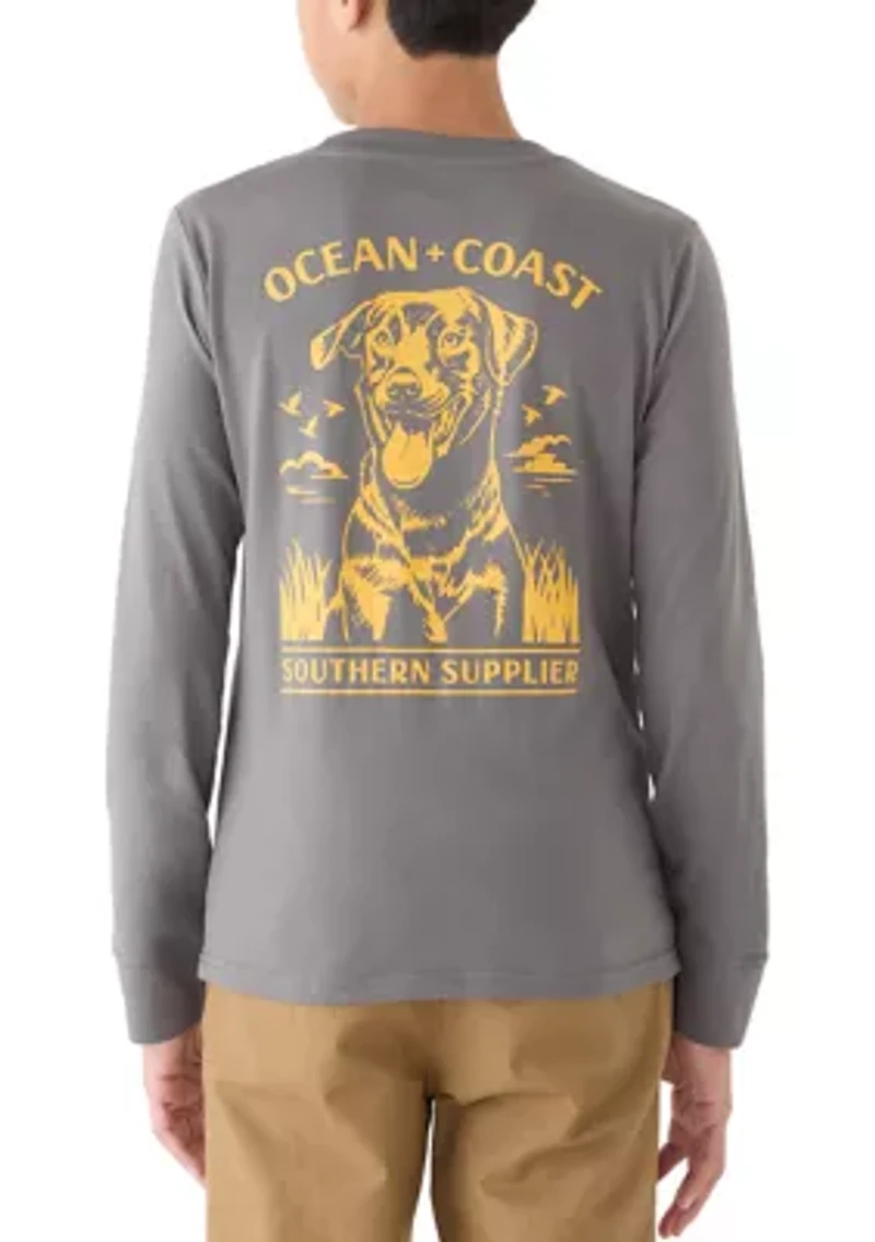 This Ocean + Coast® t-shirt is perfect for active boys. Featuring a classic crew neck and easy pullover closure, it offers a relaxed fit for everyday wear. Pullover Crew neck Long sleeves Imported Belk Exclusive Material & Care Cotton, polyester Machine washable