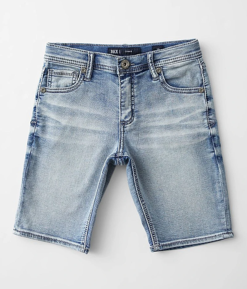 Regular fit short Superior stretch fabric, our highest level of stretch for ultimate movement Adjustable waistband Mid-rise 9" inseam Pieced and darted back pockets Hand sanding, whiskering, and grinding details Zip fly Sizes 4-6 have a snap closure