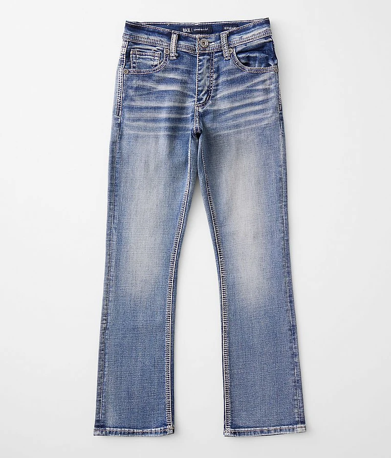 Regular fit bootcut jean Superior stretch fabric for a higher level of flexibility Adjustable waistband Mid-rise, 13 1/2" bottom opening Pieced and darted back pockets Hand sanding, whiskering, and veining details Zip fly Sizes 4-6 have a snap closure