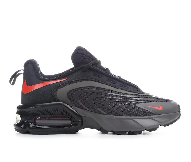 Boys' Nike Air Max Fire Grade School Running Shoes Designed to turn heads and power through play, this energetic sneaker pairs futuristic style with all-day support. The breathable mesh upper keeps feet cool, while wavy overlay patterns and a visible Air unit bring serious style and cushioned comfort. A padded interior and classic lace-up closure help lock in the fit, and the sculpted rubber outsole grips the ground for confident movement wherever they go.