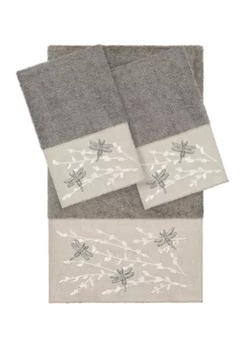 The Braelyn Embellished Towel Collection features glittering dragonflies flying among delicate branches embroidered on a linen-look textured woven cloth border. These soft and luxurious towels are made of 100% premium Turkish Cotton and offer lasting absorbency and superior durability. • 100% Premium Turkish Cotton • Superbly absorbent and quick drying • Available in a range of lovely towel colors • Machine wash cold, No bleach, line dry or dry clean • Set includes 1 bath towel (27" x 54") / 2 hand towels (16" x 30") • Made in Turkey • Proudly Embellished in USA 3 Warranty available Turkey Imported Product Specifications Bath Towel 27" W x 54" L / Hand Towel 16" W x 30" L Material & Care Cotton Machine washable